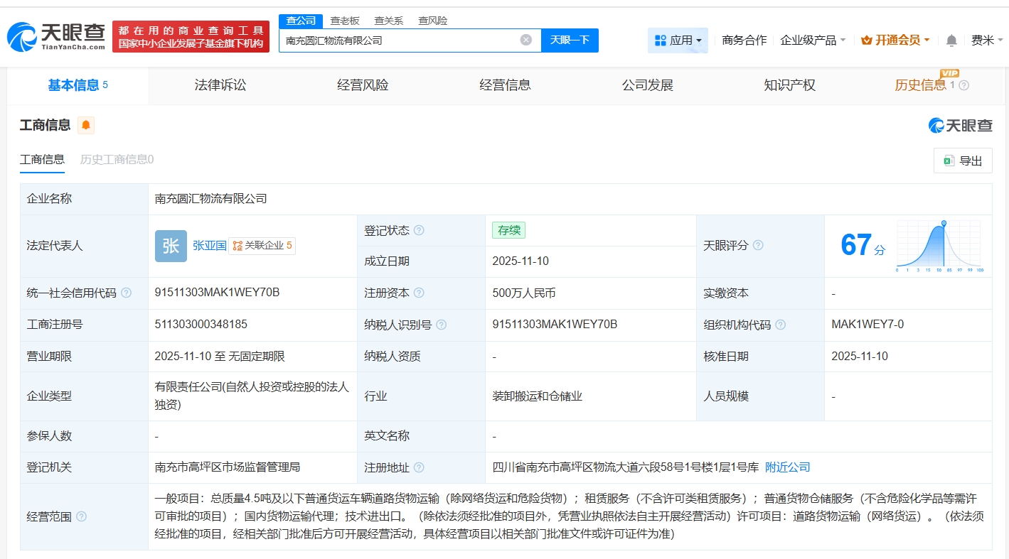 每經(jīng)AI快訊,天眼查App顯示,近日,南充圓匯物流有限公司成立,法定代表人為張亞國,注冊資本500萬元人民幣,經(jīng)營范圍包括租賃服務(wù)、普通貨物倉儲服務(wù)、國內(nèi)貨物運輸代理等。股東信息顯示,該公司由圓通速遞有限公司全資持股。