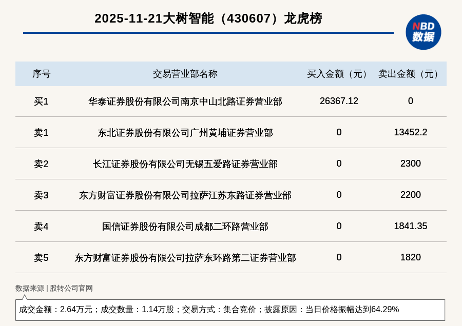 每經(jīng)訊,2025年11月21日,新三板創(chuàng)新層公司大樹(shù)智能(430607,收盤(pán)價(jià):2.3元)登上龍虎榜,交易方式是集合競(jìng)價(jià),披露原因是當(dāng)日價(jià)格振幅達(dá)到64.29%,成交數(shù)量1.14萬(wàn)股,成交金額2.64萬(wàn)元。買(mǎi)一席位為華泰證券股份有限公司南京中山北路證券營(yíng)業(yè)部,買(mǎi)入2.64萬(wàn)元;賣(mài)一席位為東北證券股份有限公司廣州黃埔證券營(yíng)業(yè)部,賣(mài)出1.35萬(wàn)元。
