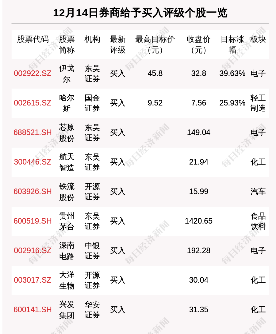 每經(jīng)AI快訊,12月14日,券商給予評級的個股數(shù)共有11只,獲得買入評級的個股數(shù)共有9只。在公布了目標(biāo)價(jià)格的2只個股中,按照最新收盤價(jià)計(jì)算,預(yù)期漲幅排名居前的個股是伊戈?duì)枺?02922.SZ)、哈爾斯(002615.SZ),預(yù)期漲幅分別是39.63%、25.93%。