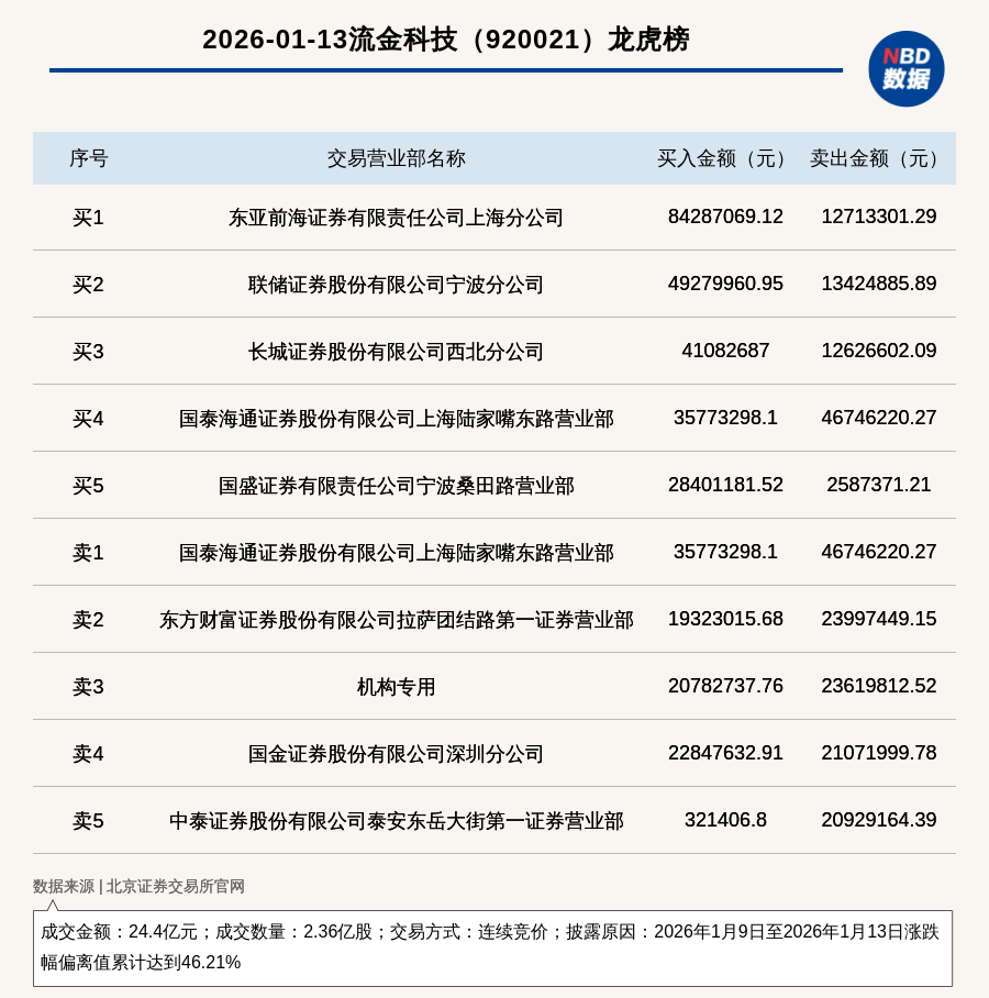 每經(jīng)訊,2026年1月13日,北交所上市公司流金科技(920021,收盤價(jià):10.44元)登上龍虎榜,交易方式是連續(xù)競(jìng)價(jià),披露原因是2026年1月9日至2026年1月13日漲跌幅偏離值累計(jì)達(dá)到46.21%,成交數(shù)量2.36億股,成交金額24.4億元。買一席位為東亞前海證券有限責(zé)任公司上海分公司,買入8428.71萬(wàn)元;賣一席位為國(guó)泰海通證券股份有限公司上海陸家嘴東路營(yíng)業(yè)部,賣出4674.62萬(wàn)元。