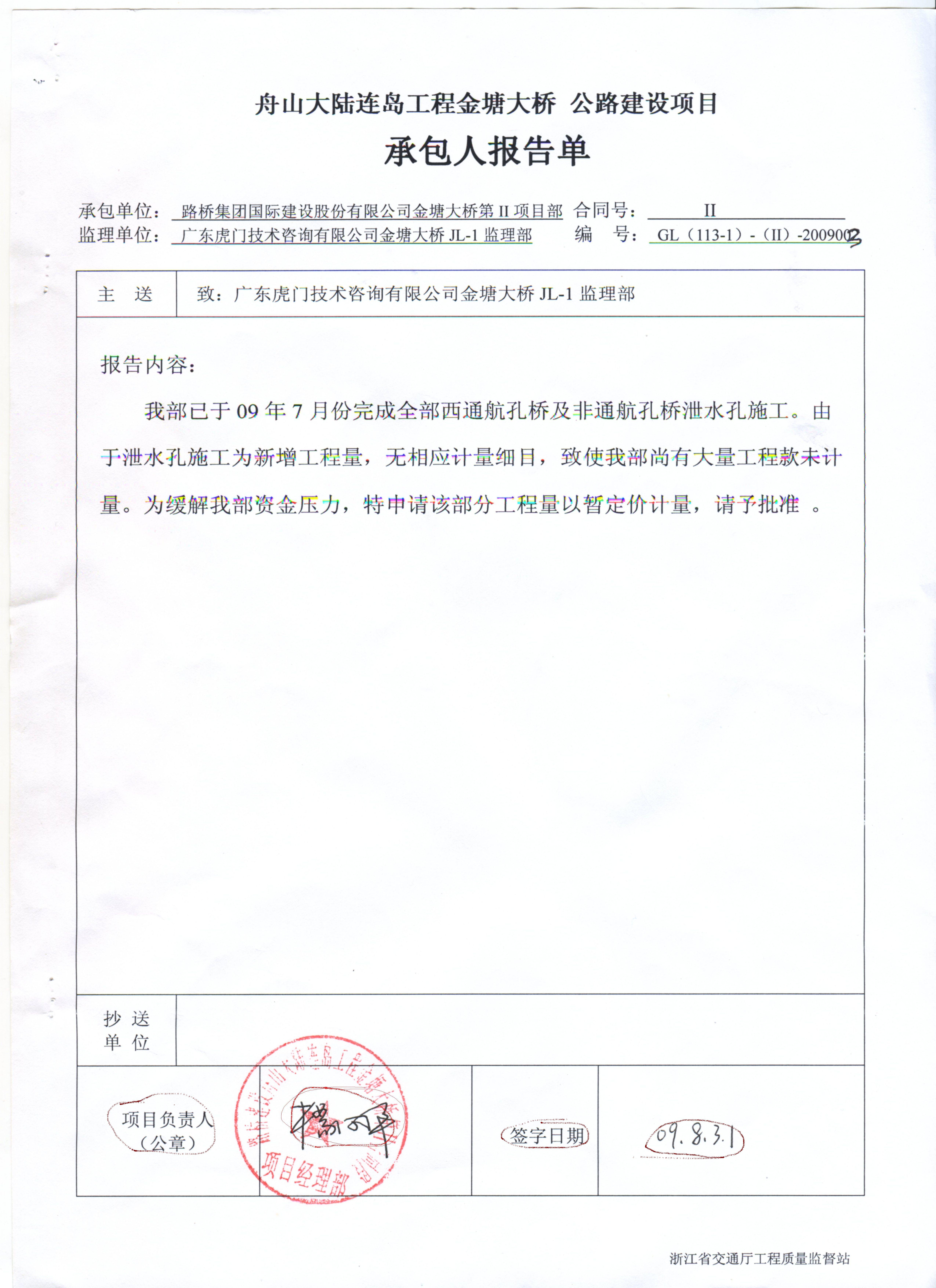 7月29日,舉報(bào)人楊之君(化名)在國(guó)內(nèi)某知名論壇上發(fā)布了浙江舟山跨海大橋存在非法轉(zhuǎn)包、偽造簽名等問(wèn)題的舉報(bào),并附上大量的大量的原始資料,該貼立即引起廣泛關(guān)注,更新甚至超過(guò)達(dá)到十頁(yè),三天之后,舉報(bào)人接受了記者近4個(gè)小時(shí)的當(dāng)面采訪。【更多】